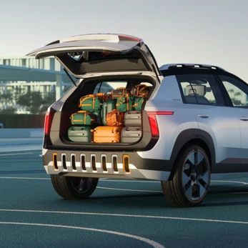Auch am Heck zeigt der Škoda Epiq seine unverwechselbare Designsprache. Die T-förmigen LED-Rückleuchten greifen die Lichtsignatur der Front auf und sorgen für Wiedererkennung – bei Tag und Nacht. In Kombination mit dem geschwungenen Dachspoiler und den robusten Formen des hinteren Stoßfängers entsteht ein kraftvoller, souveräner Auftritt.