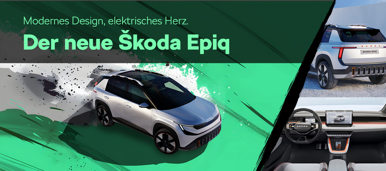 Mit dem neuen Epiq läutet Škoda eine neue Ära der E-Mobilität ein. Auf nur 4,1 Metern Länge entsteht maximaler Raum für bis zu fünf Personen und 475 Liter Gepäck. Die moderne Designsprache „Modern Solid“ verbindet sich mit einer Reichweite von über 400 Kilometern zu einem perfekten Stadtflitzer, der auch auf längeren Strecken überzeugt. Der Epiq macht elektrisches Fahren für alle zugänglich – ohne Kompromisse bei Qualität und Platzangebot.